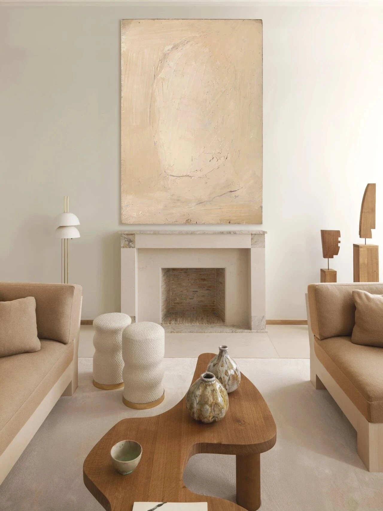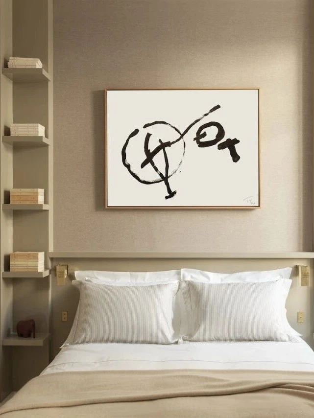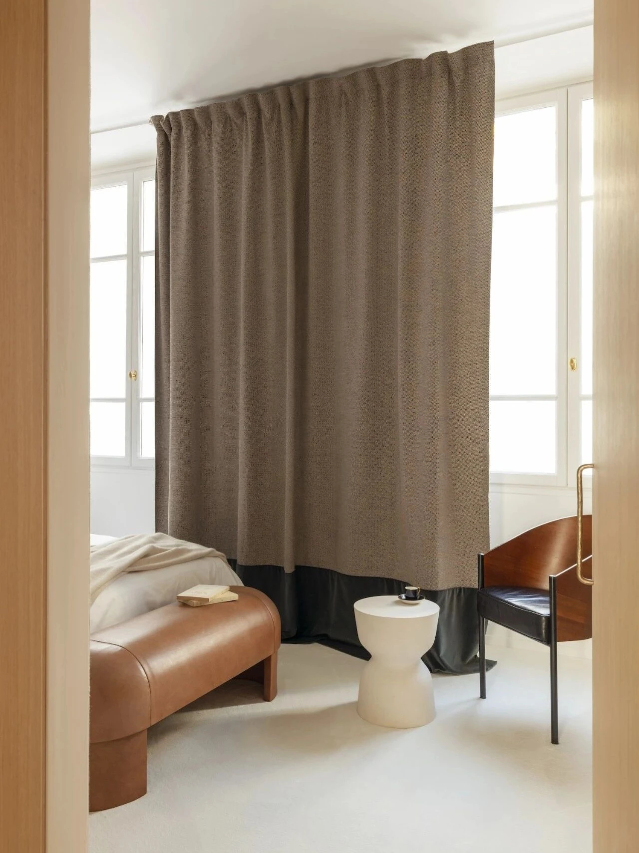 浅调橡木家具贯穿全屋,柔和的木质质感中和石材的冷硬,成为空间最好的过渡媒介。私密卧室区域更注重氛围感塑造,羊毛饰面墙面搭配象牙色柔软地毯,触感温润细腻,层层堆叠出松弛、治愈的居住氛围。整体设计摒弃多余装饰,纯粹依靠格局梳理与材质对话,既尊重了巴黎老城的历史底蕴,也完美适配当代人简约高级、舒适松弛的居住方式。