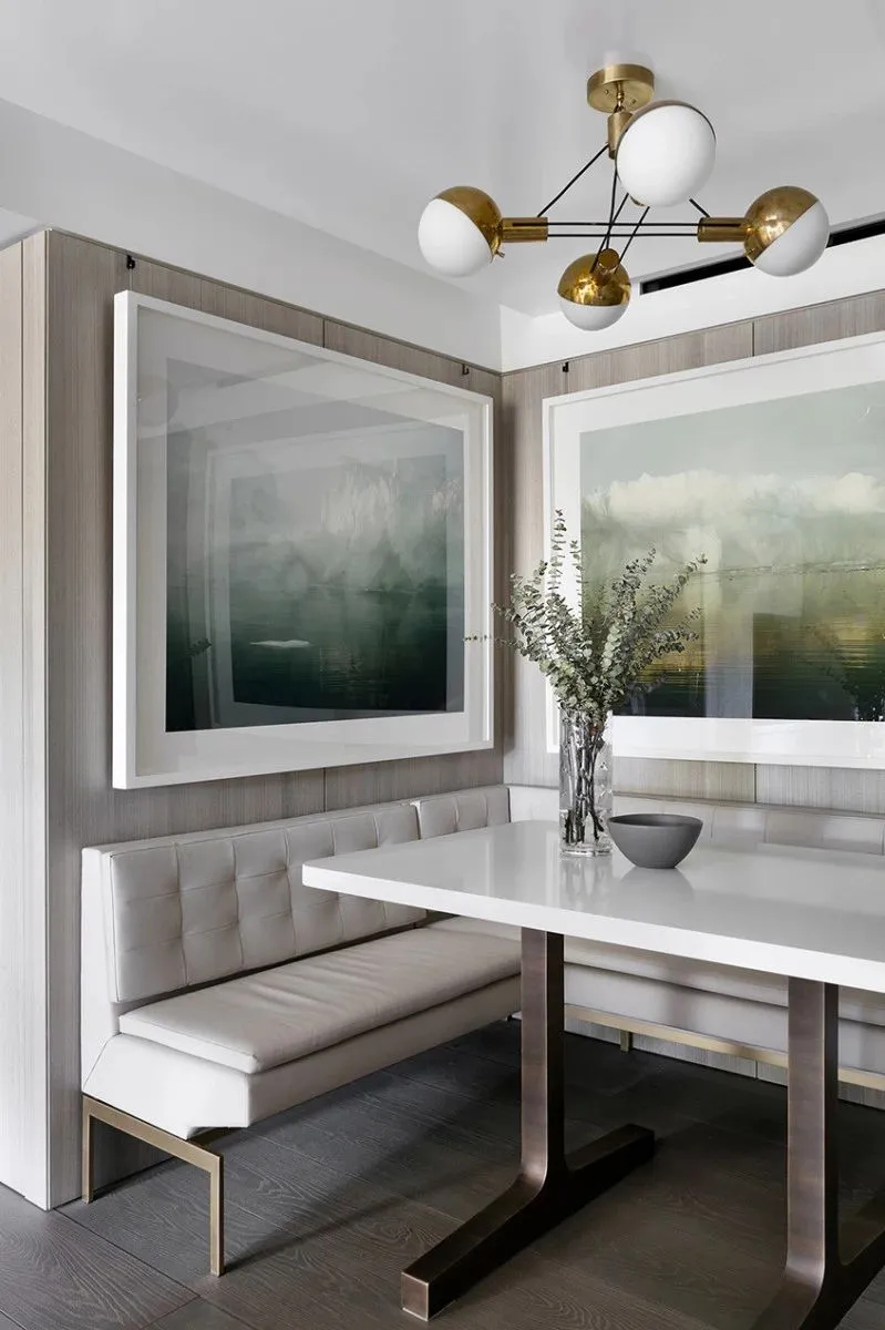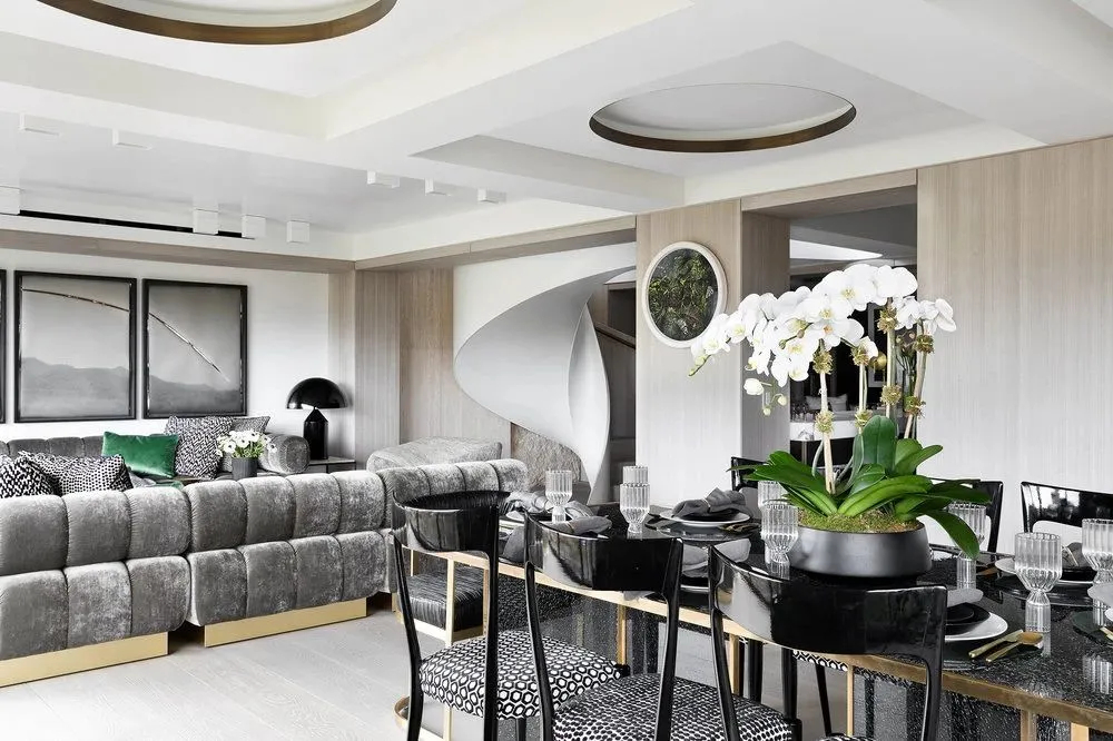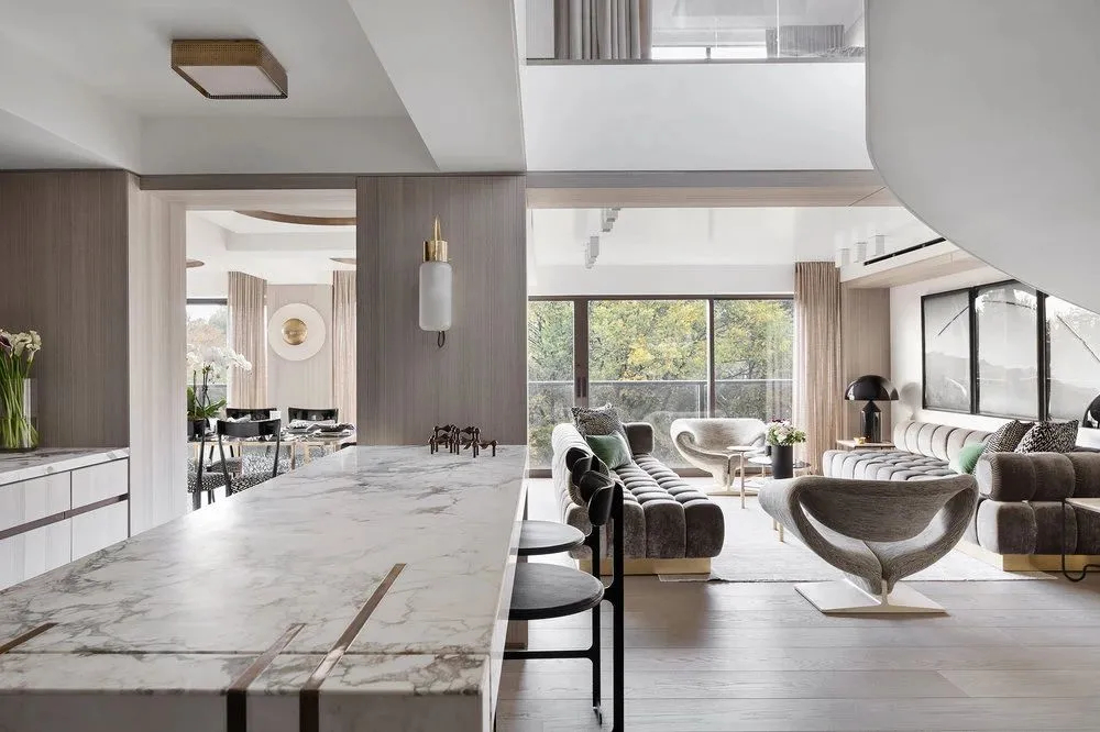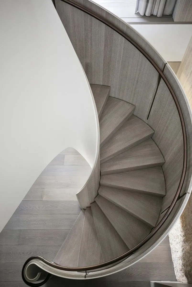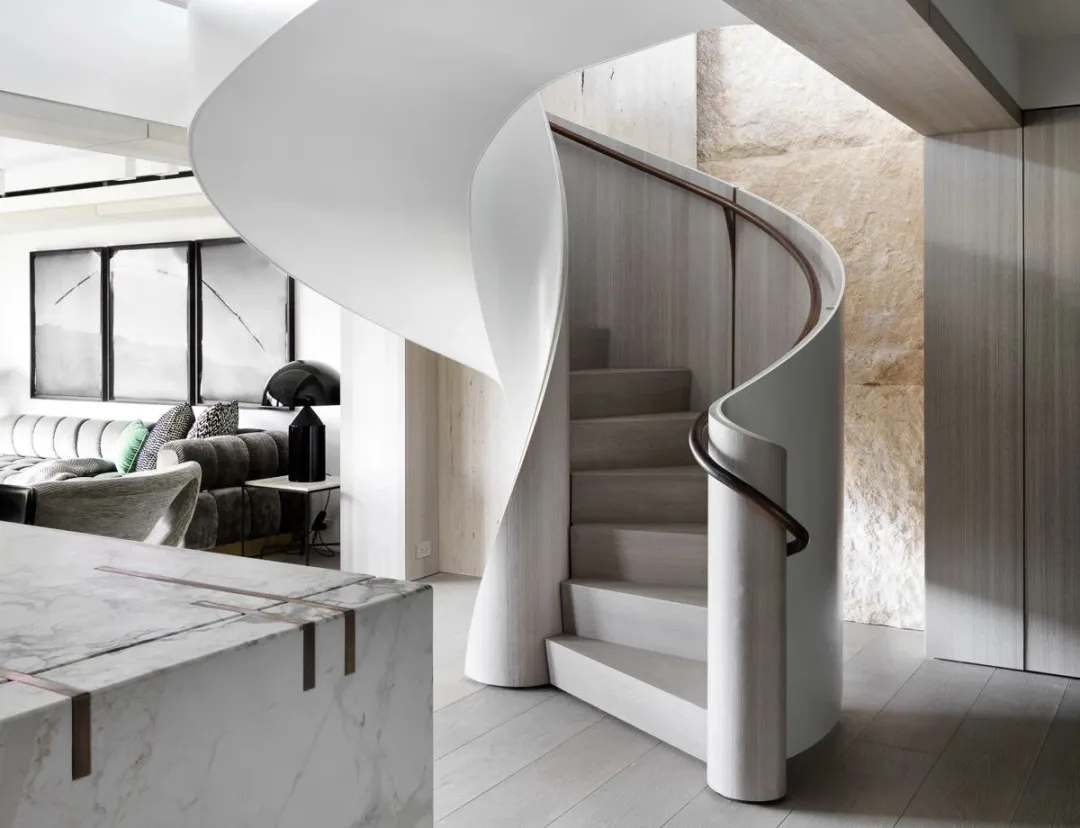 公区的餐厅是全屋质感的核心亮点,空间以浅系木饰面、精致黄铜构件与天然大理石为主要材质,三种质感温柔碰撞,塑造出优雅内敛的轻奢格调。窗外繁茂葱郁的绿植映入室内,自然景致与精致硬装相互交融,无需多余装饰,便轻松烘托出高级通透的居家奢华氛围,兼顾日常用餐与轻社交需求。居于空间中央的旋转楼梯,是全屋的视觉枢纽,流畅柔和的曲线如同垂落的丝绸,自然串联起上下两层空间,灵动的造型也为简约的居家格局增添了满满的艺术层次。
