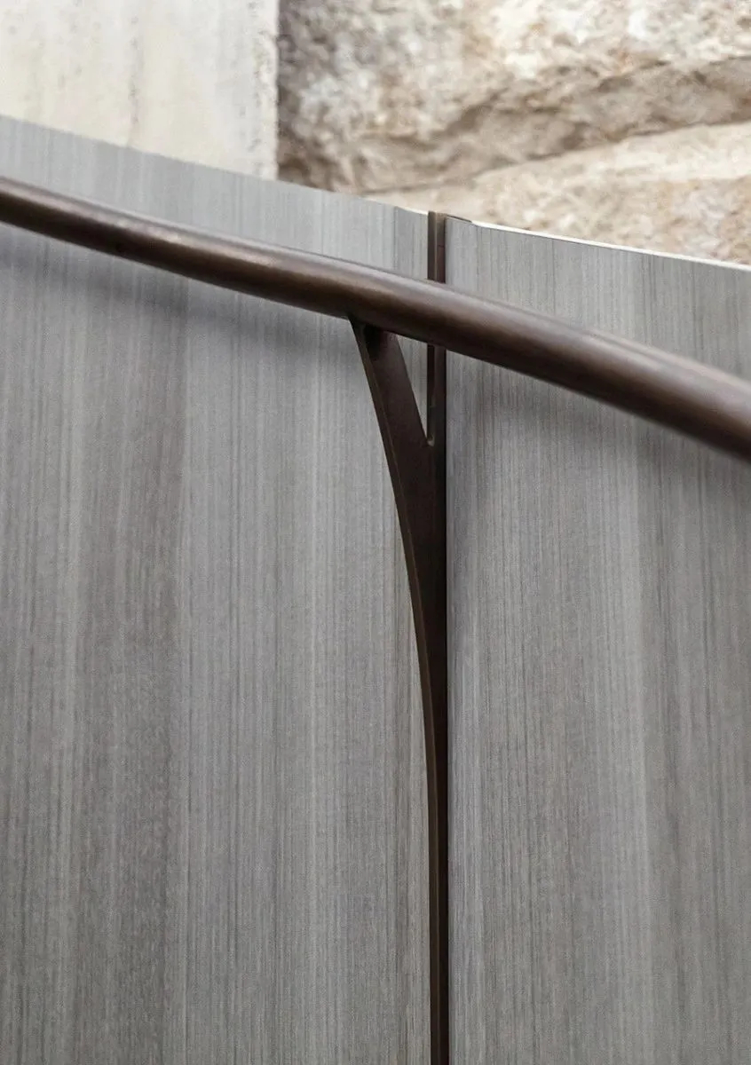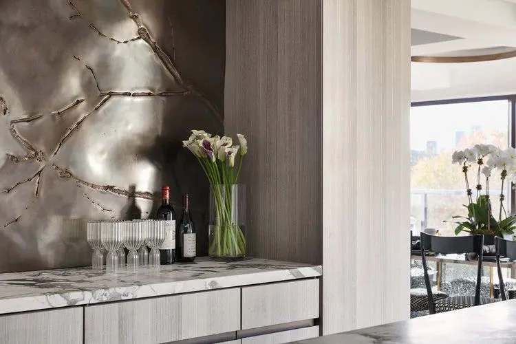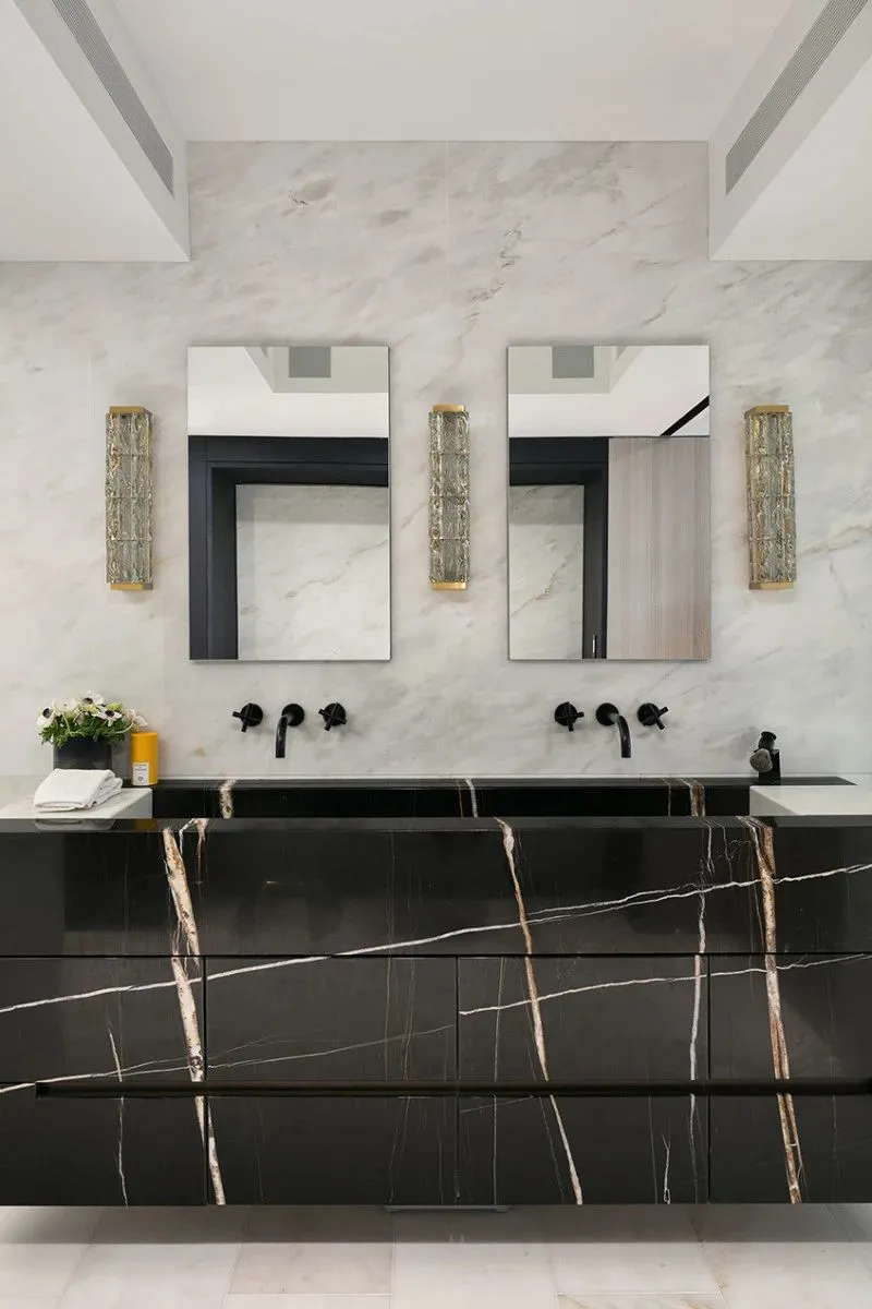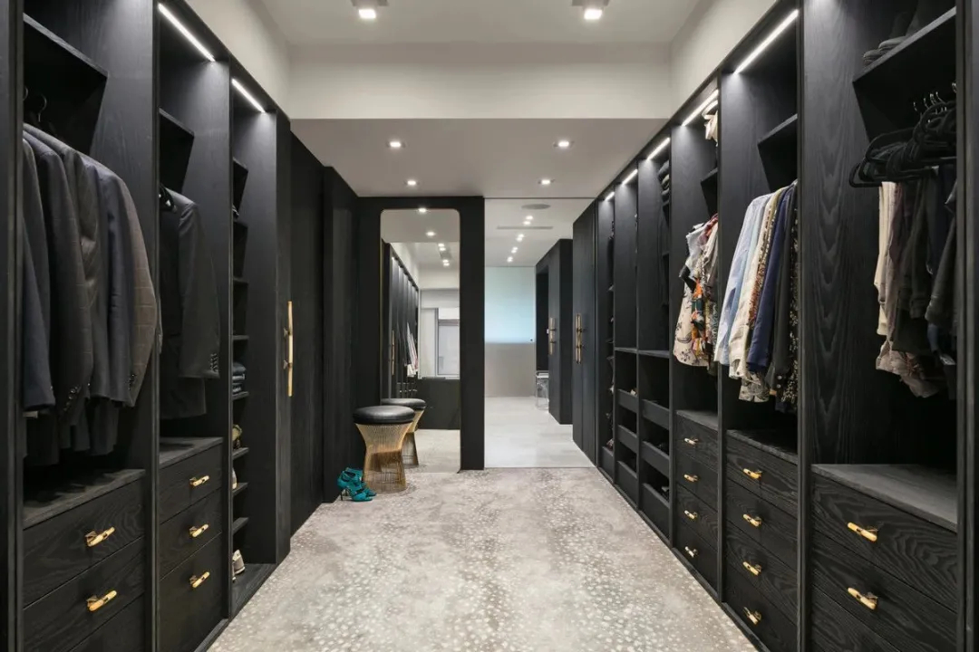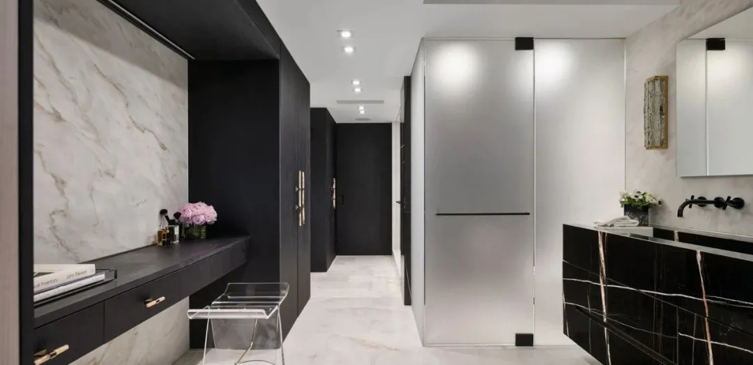 空间在色彩与材质的对比设计上极具巧思。衣帽间大胆采用全黑设计,沉稳纯粹的黑色柜体,搭配精致金色五金手柄,黑金经典碰撞,低调奢华,高级感十足。浴室的设计同样暗藏细节,洗手台天然大理石自带恣意灵动的纹理,如同暗夜闪电划过板面,层次独特、氛围感拉满,让洗漱这一日常场景,也拥有独一无二的美学体验,诠释出精致且松弛的高阶居家方式。