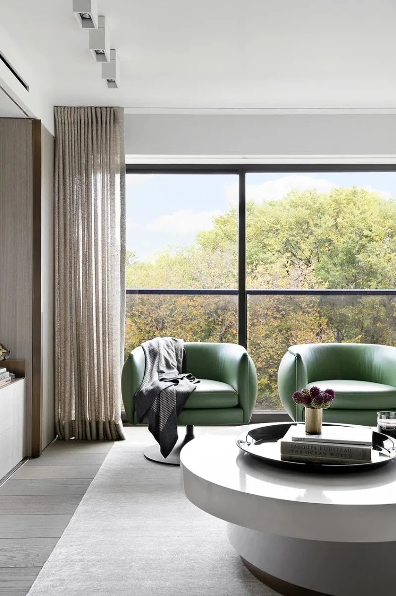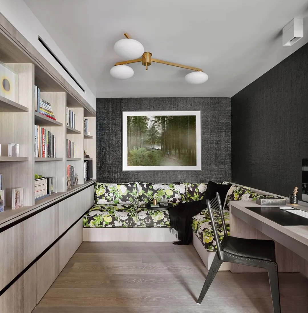 二层作为专属休憩区域,氛围更加静谧松弛。卧室坐拥绝佳观景视野,窗外成片绿植四季常青,晨起推窗即可拥抱自然绿意,治愈日常琐碎。搭配造型别致的艺术吊灯,细腻点缀空间,简单却极具设计感,让休憩空间温柔又精致。毗邻的书房主打自然森系基调,大面积森林主题墙画搭配一体式绿色L型沙发,将山野绿意搬进室内,在繁华的城市公寓里,打造出一方静谧治愈、适合阅读与办公的独处天地。