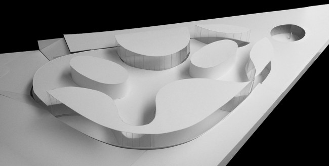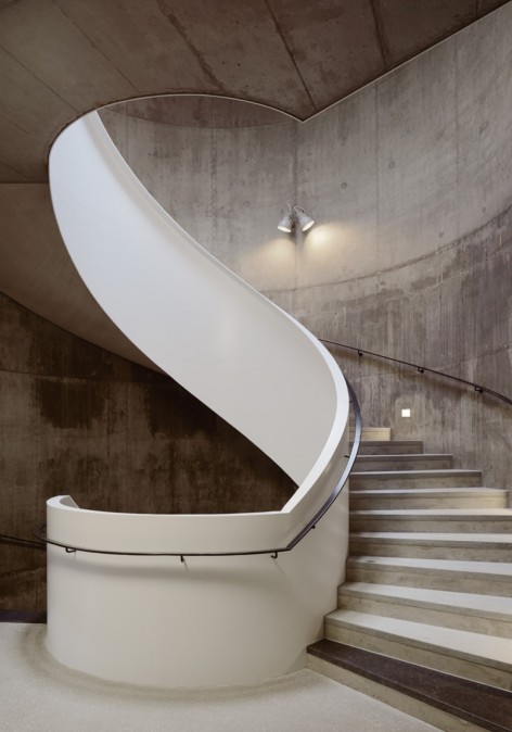建筑的室内设计十分灵活。弧形的墙面围合出自由流动的连续空间,营造开放而非闭塞的氛围。建筑师对室内路径和开窗的精心设计更像是在做一个景观项目而非传统的学院建筑。在入口层平面,宽敞的门厅同时也可用作开放的讲堂,建筑师还在此设计了一系列两层通高的工作室和展厅。这些功能空间的外墙围合出灵活丰富的走廊空间。