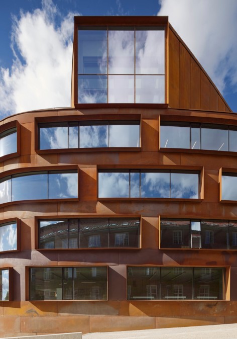 校园的整体布局比较松散,基于同样的逻辑,建筑师设计了一座外形圆润、平面自由的建筑,鼓励学生在室内和建筑周边多多走动,以此让新的学院和基地更融洽地结合在一起。六层高的教学楼包括一个屋顶平台和一个有着连续空间的下沉庭院。锈蚀钢铁立面同周围深红色的砖体建筑交相呼应。