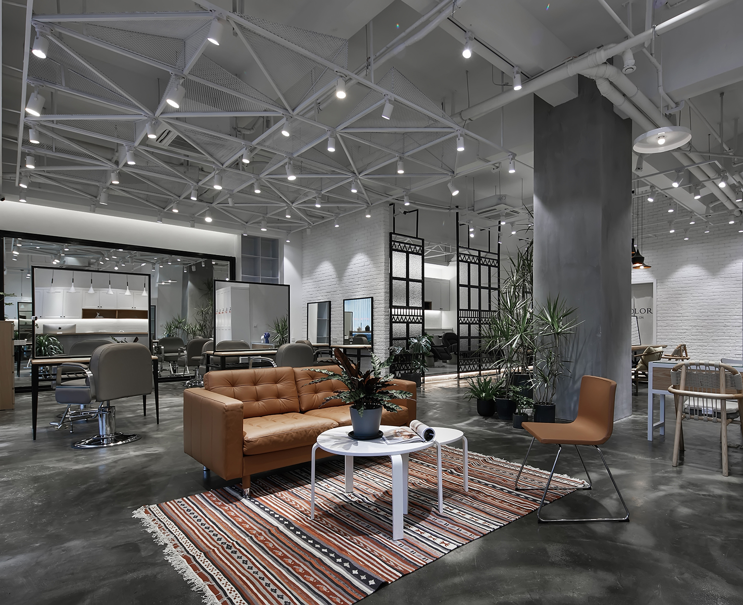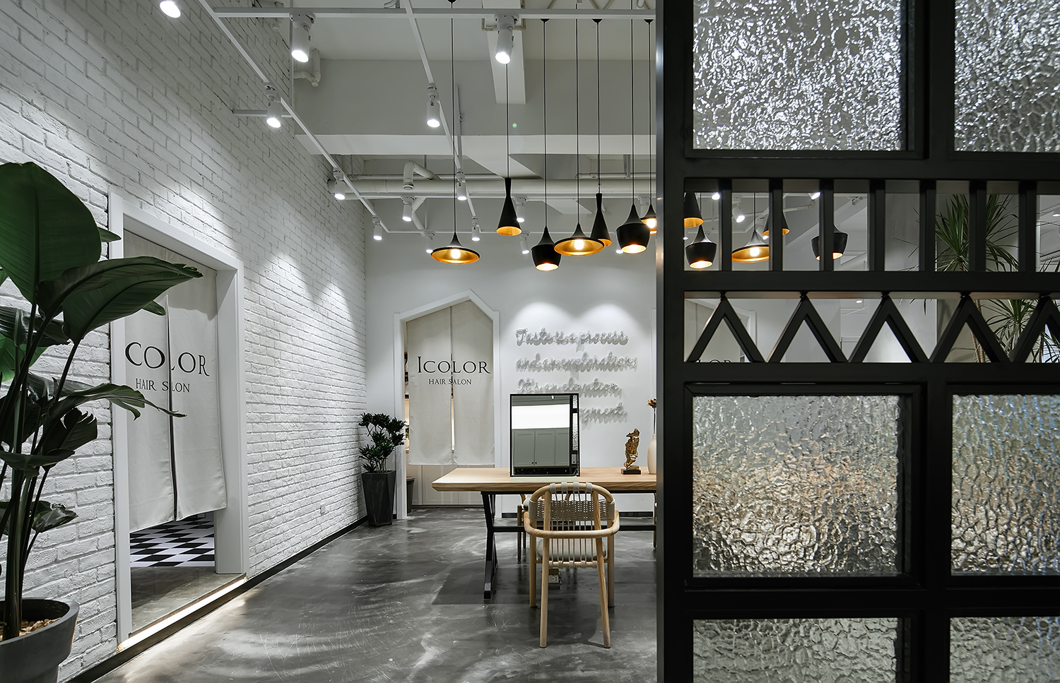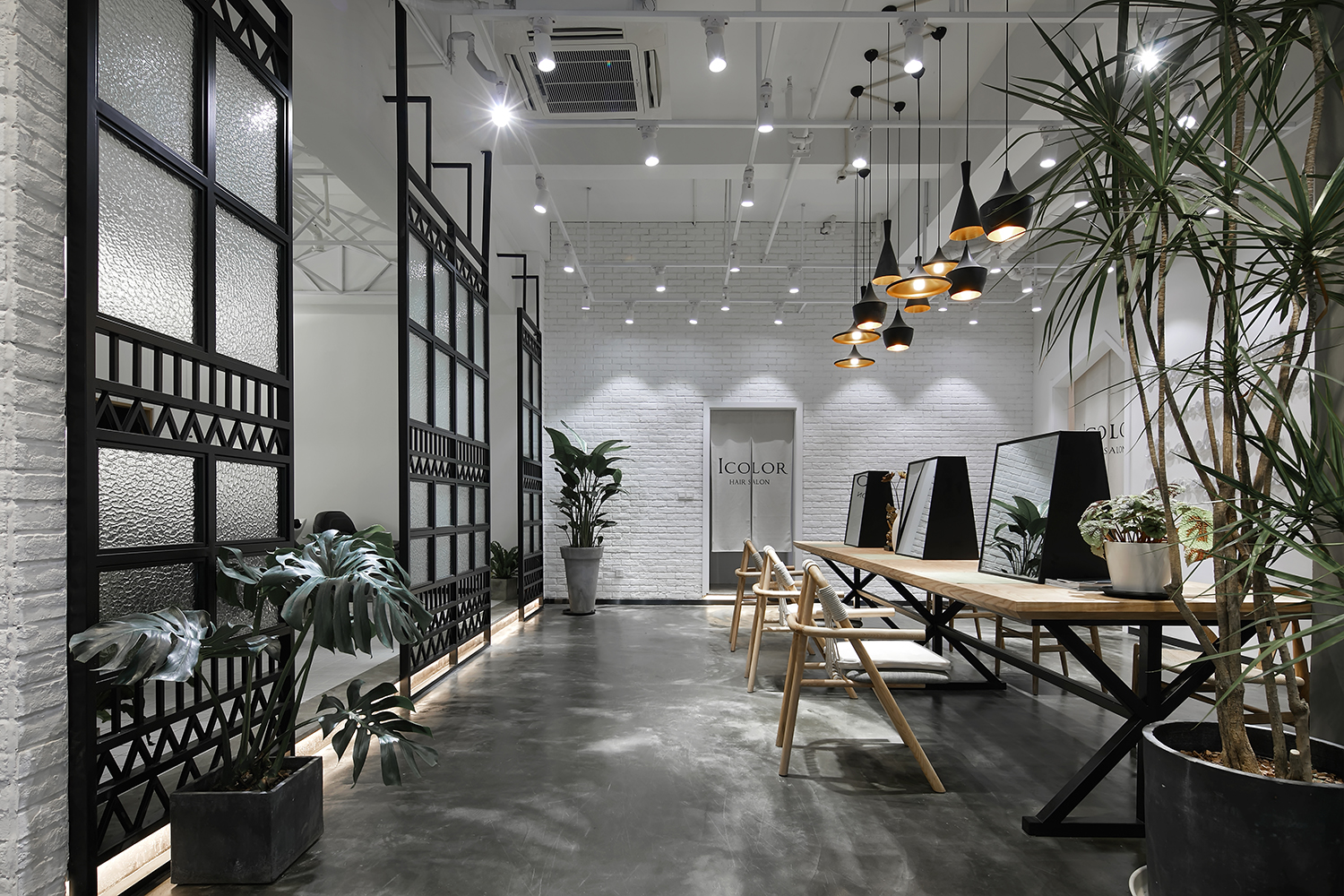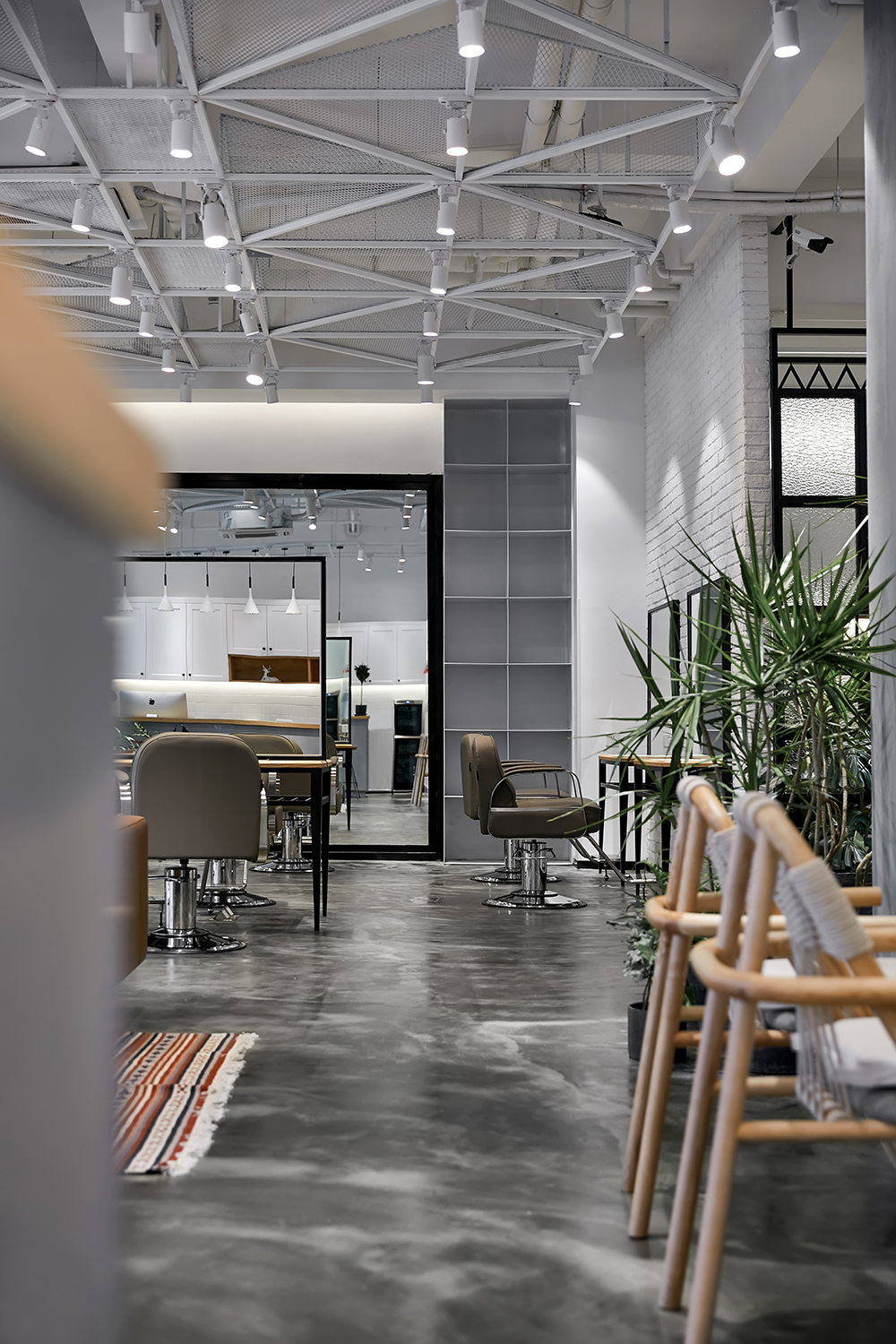 本案作品是一家专业发廊,经营者也是从业多年而且对空间有一定要求的完美主义者,由此经磋商就有了这样一个空间,整体设计贯彻“简约时尚“为宗旨,注重功能区域的合理性,符合当下主流消费群体的审美,材质也是比较常见易找的基本材质,这样主要为了节省装修预算成本。主要以白色为基调,黑灰配色,局部搭配暖色系软装及绿植,营造出空间的整体性。大面积运用白色也是为了避免对空间的视觉疲劳,白色也代表纯净,设计师也是希望能通过大量的白色打造空间氛围。