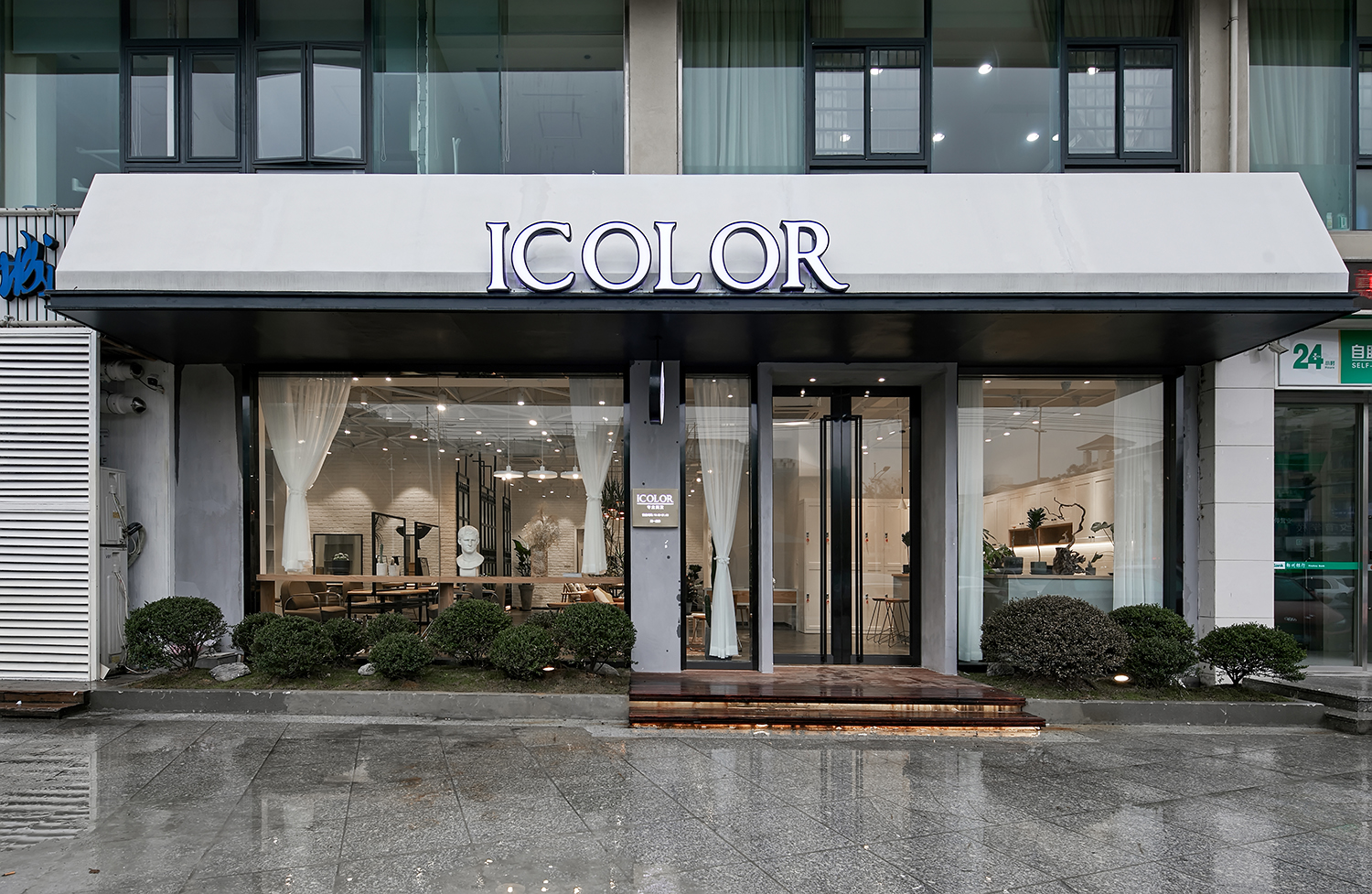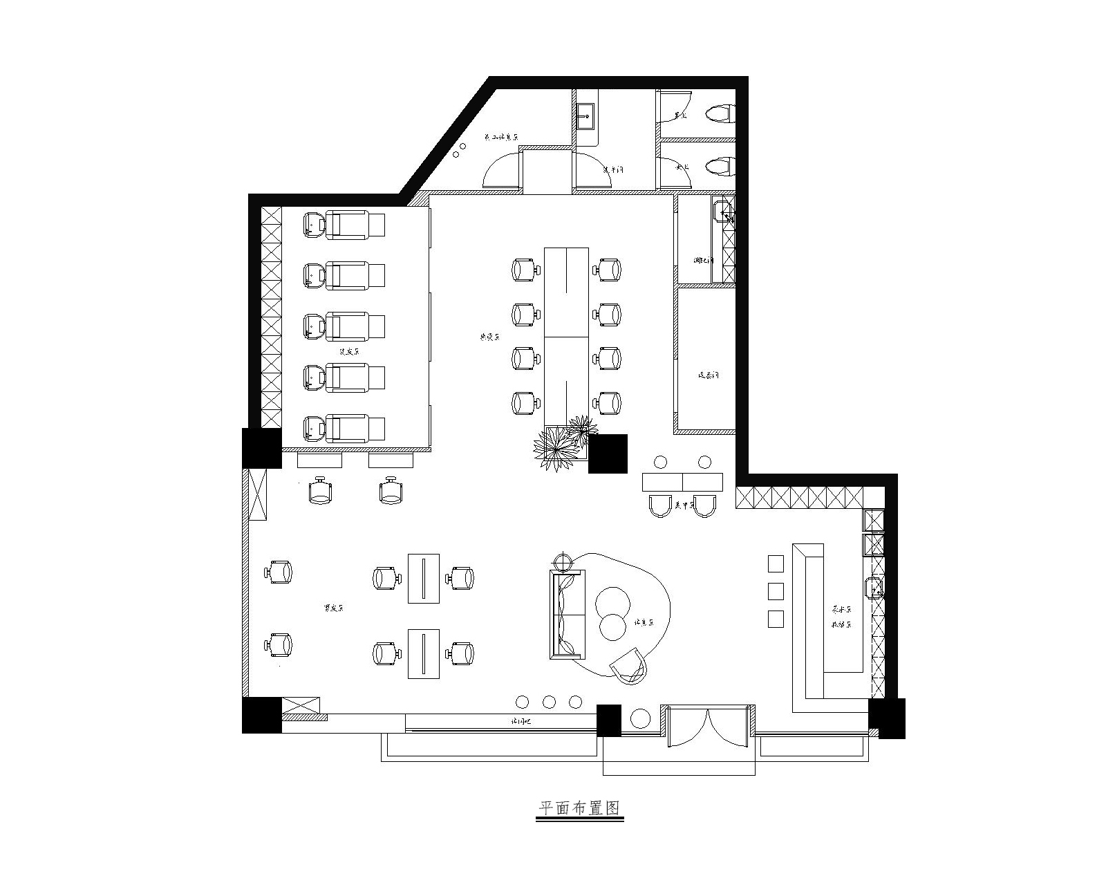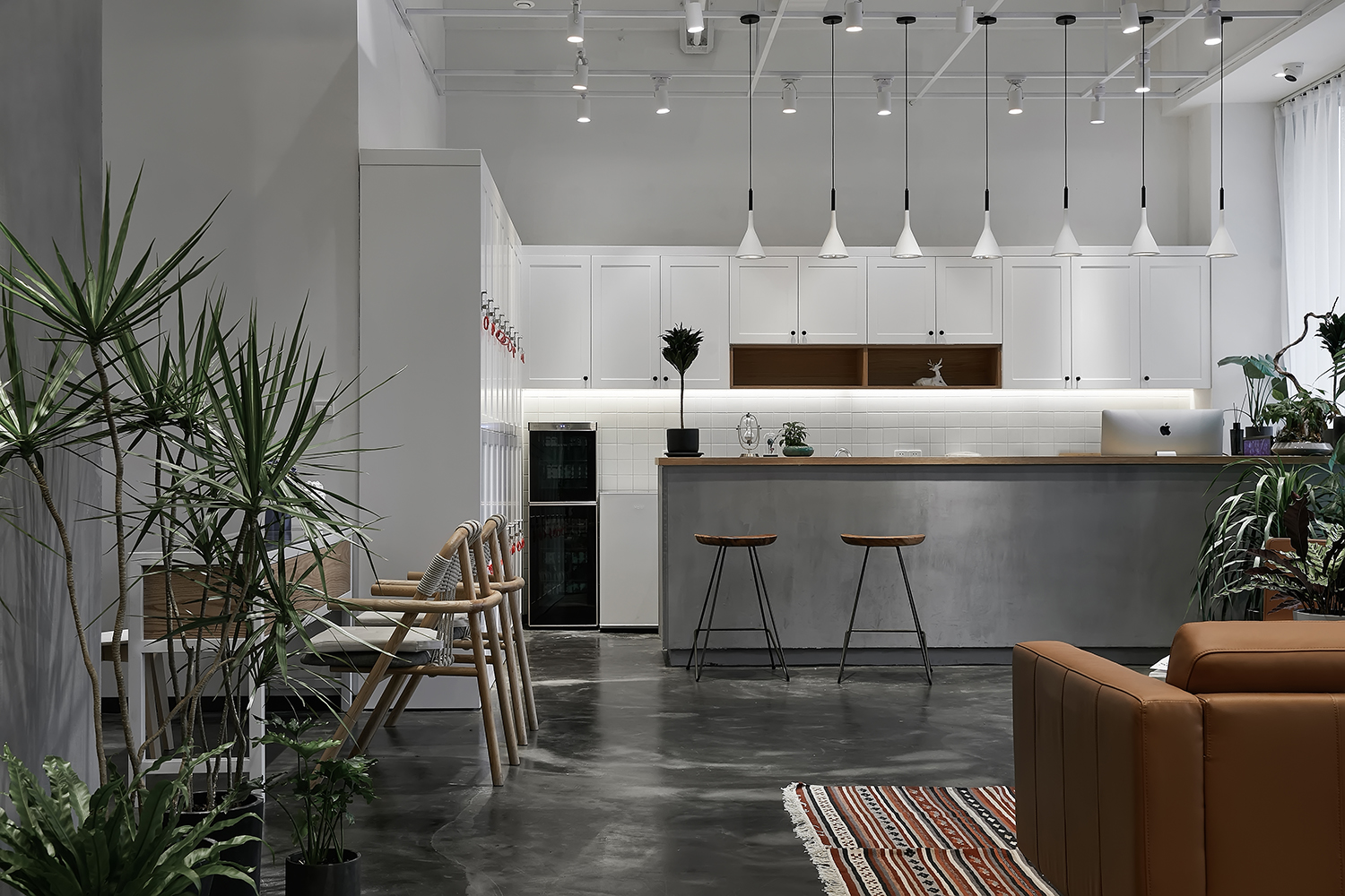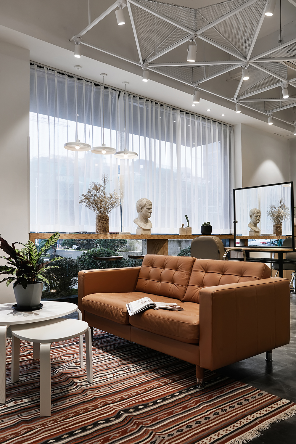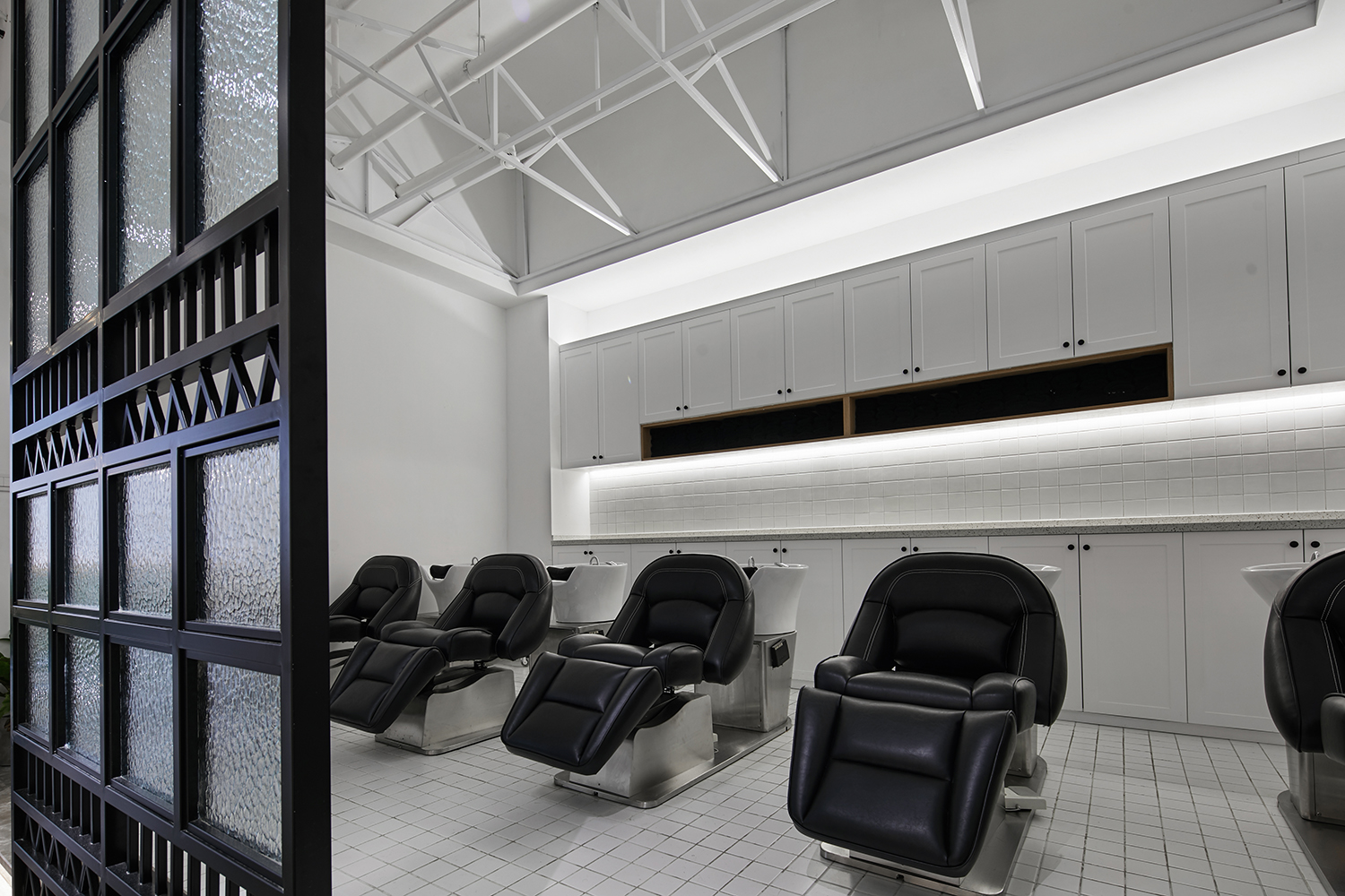 本案作品是一家专业发廊,经营者也是从业多年而且对空间有一定要求的完美主义者,由此经磋商就有了这样一个空间,整体设计贯彻“简约时尚“为宗旨,注重功能区域的合理性,符合当下主流消费群体的审美,材质也是比较常见易找的基本材质,这样主要为了节省装修预算成本。主要以白色为基调,黑灰配色,局部搭配暖色系软装及绿植,营造出空间的整体性。大面积运用白色也是为了避免对空间的视觉疲劳,白色也代表纯净,设计师也是希望能通过大量的白色打造空间氛围。