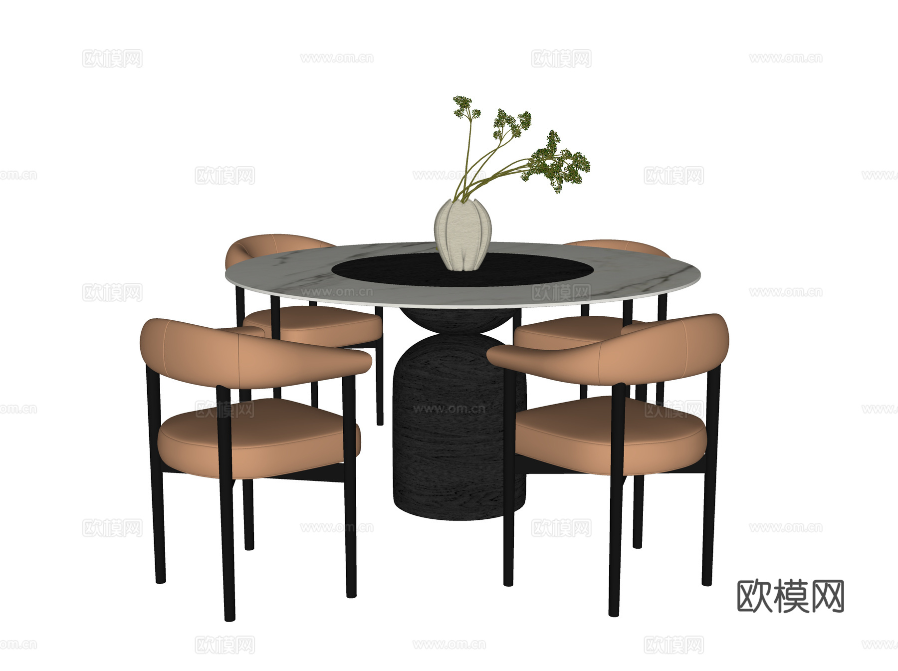 现代餐桌椅组合 餐椅 圆形餐桌 植物摆件su模型